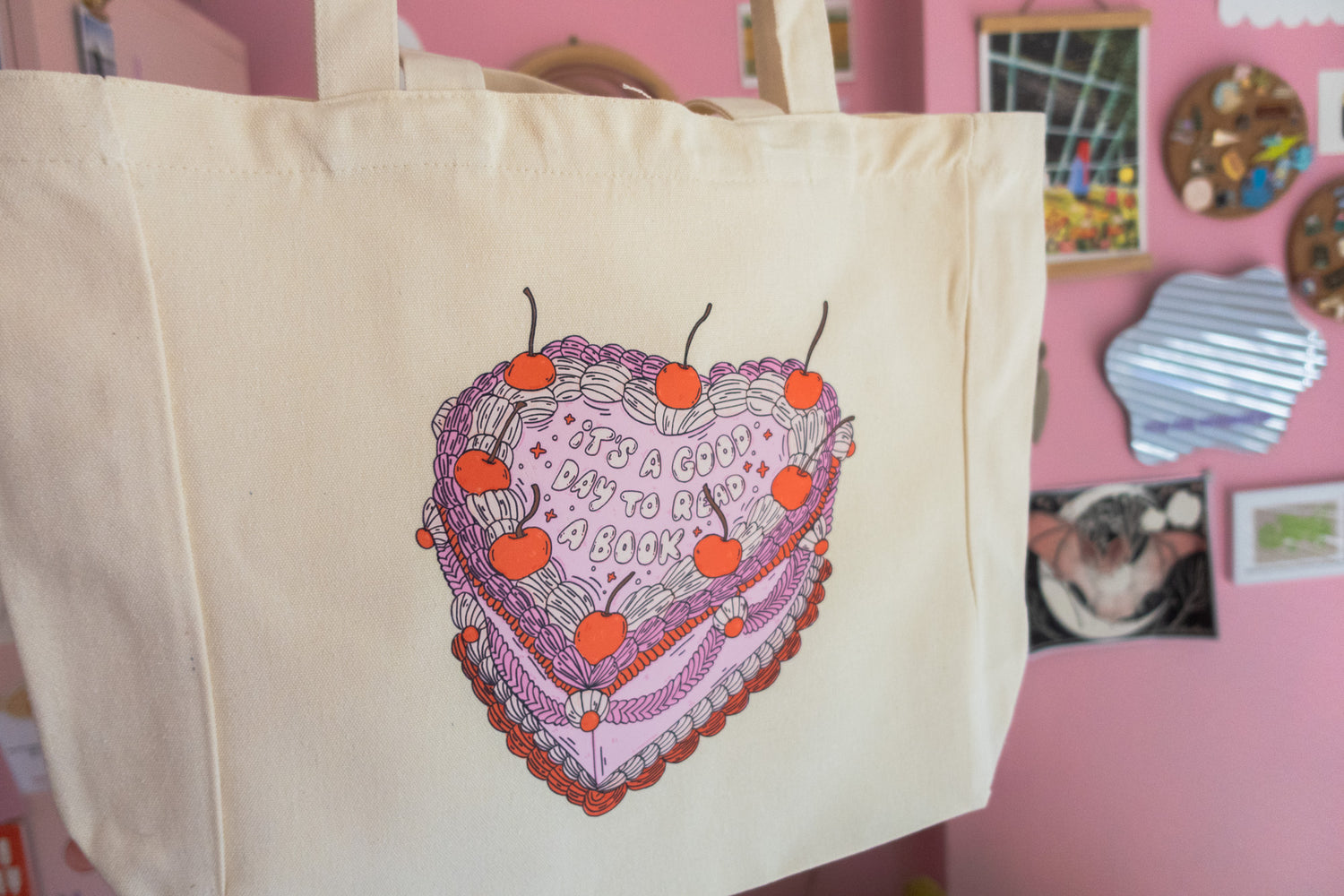Printed in house on thick canvas tote bag that was custom made with a large inside pocket that can fit a 14inch laptop + a smaller pocket for keys or wallet!