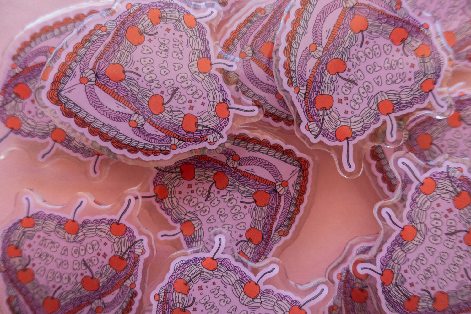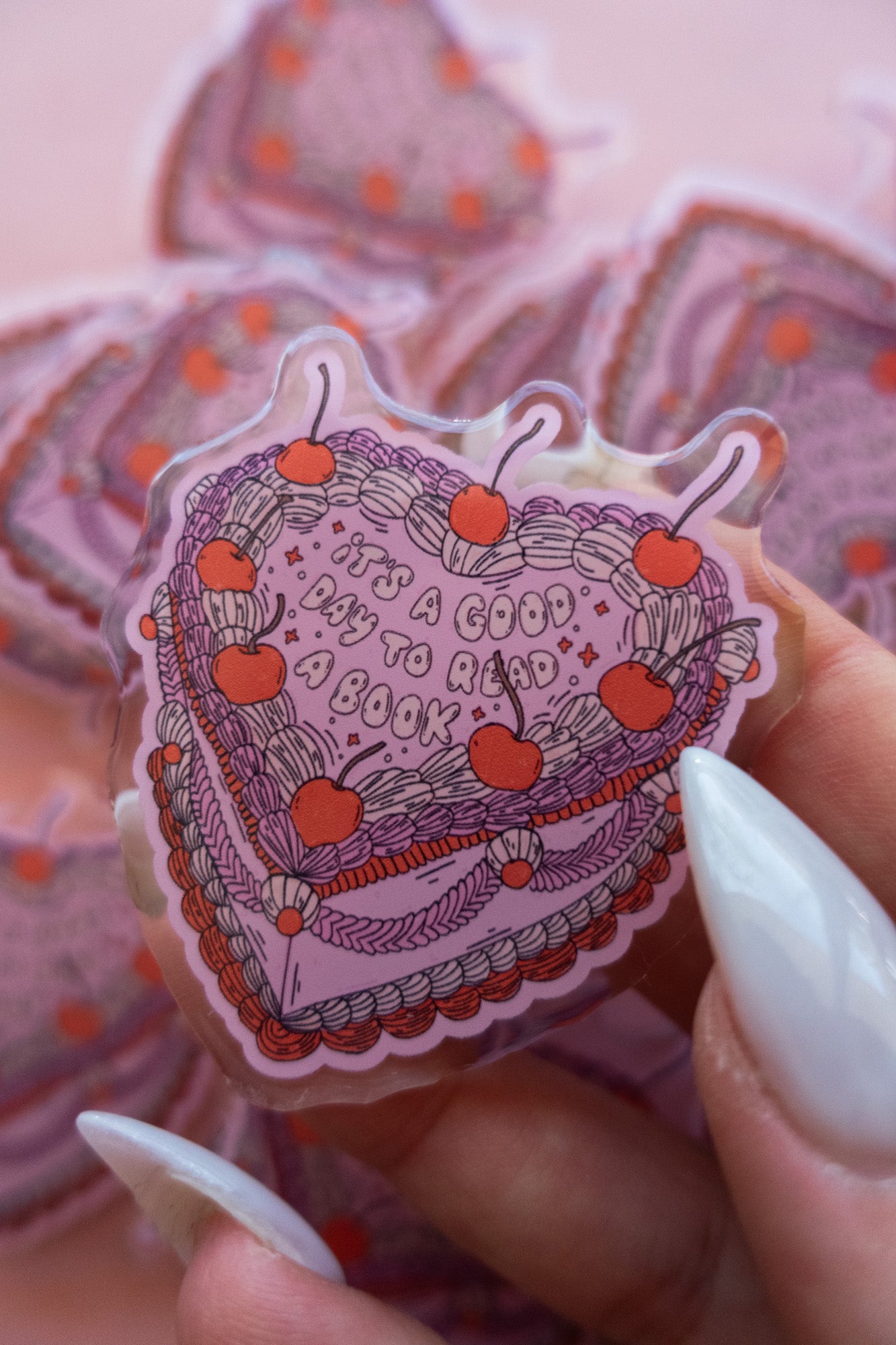 A cute little cake that reads "It's a Good Day to Read a Book"