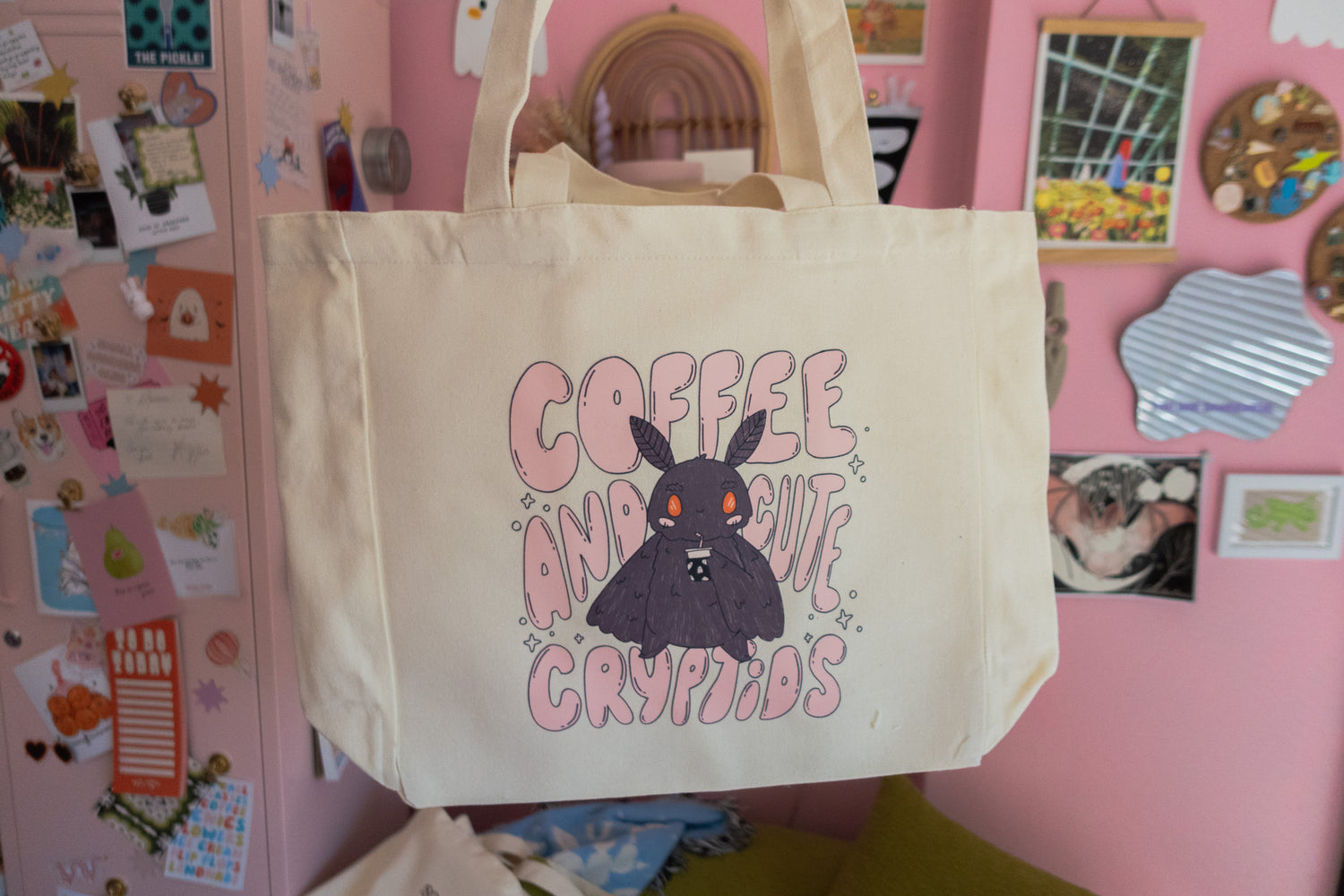 Printed in house on thick canvas tote bag that was custom made with a large inside pocket that can fit a 14inch laptop + a smaller pocket for keys or wallet!