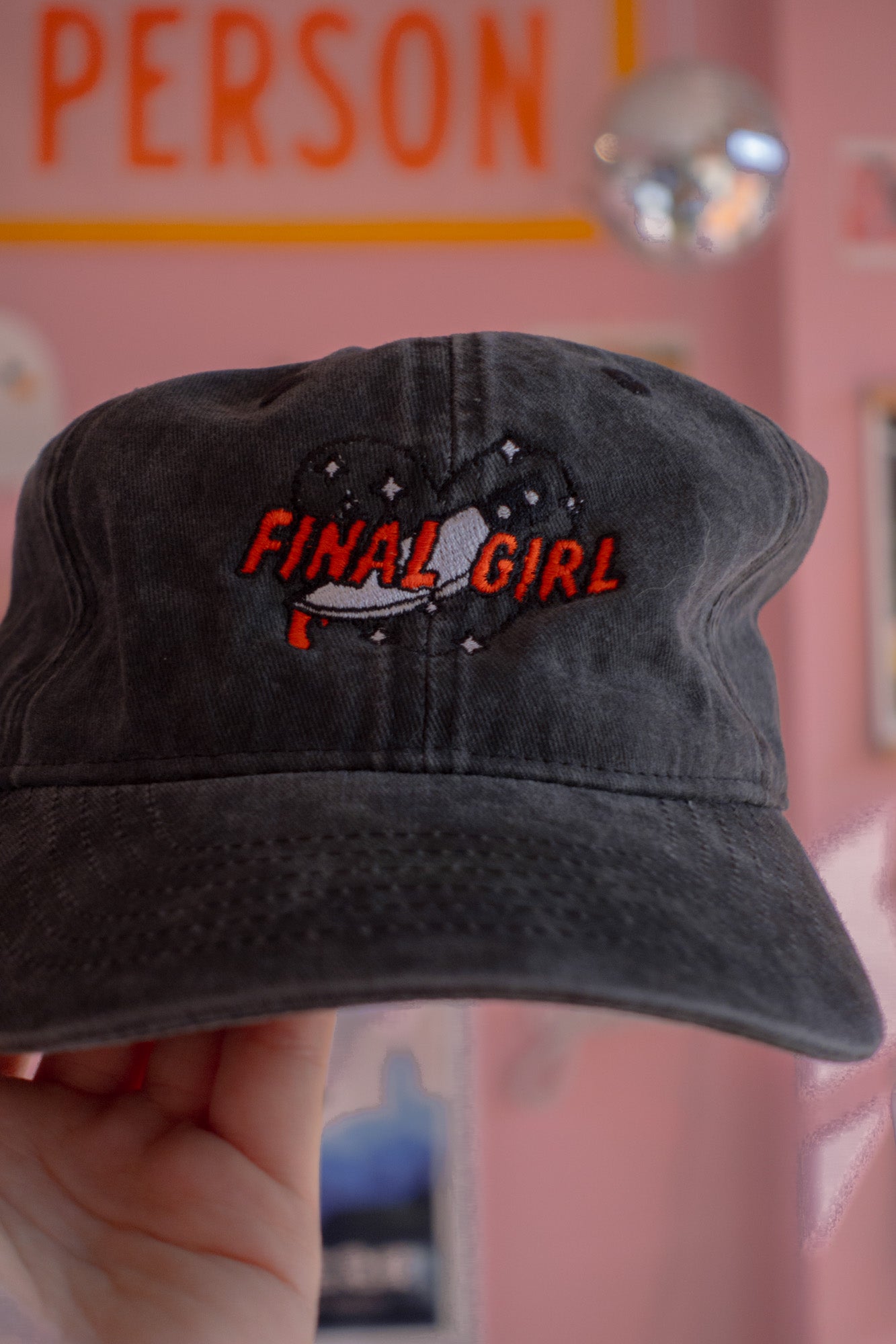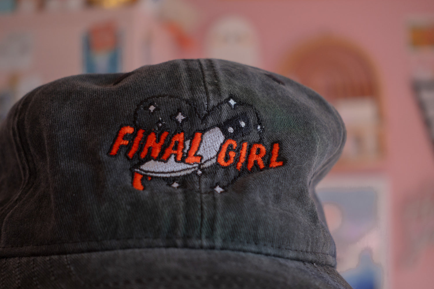 This hat is a washed black with the "final girl" embroidered on with a knife and a heart.