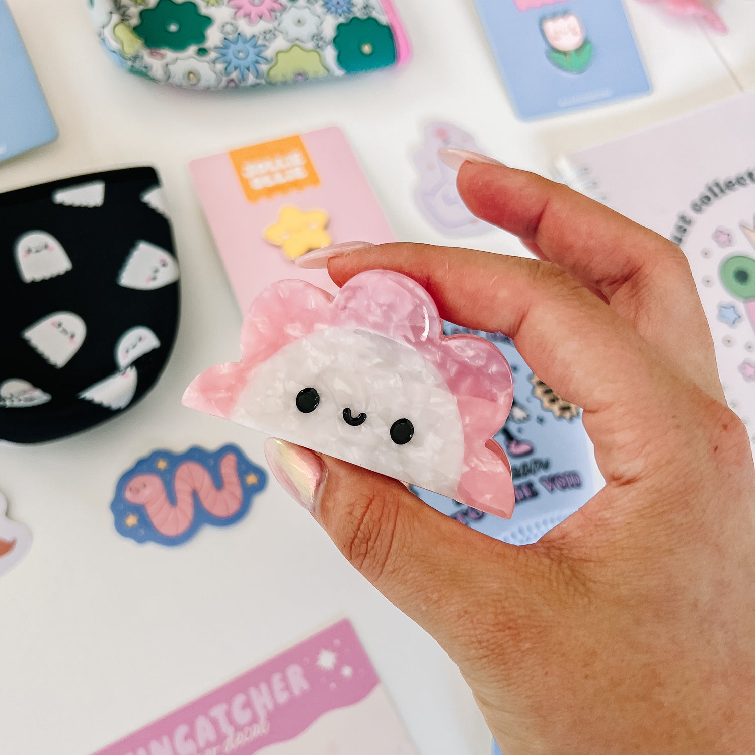 This adorable floral hair claw is the perfect way to add a touch of charm and style to your hair. The flower even has a little happy face on it.
