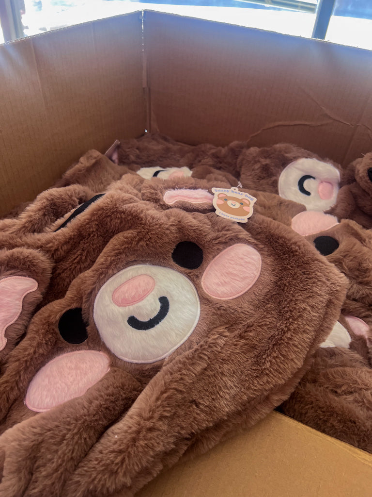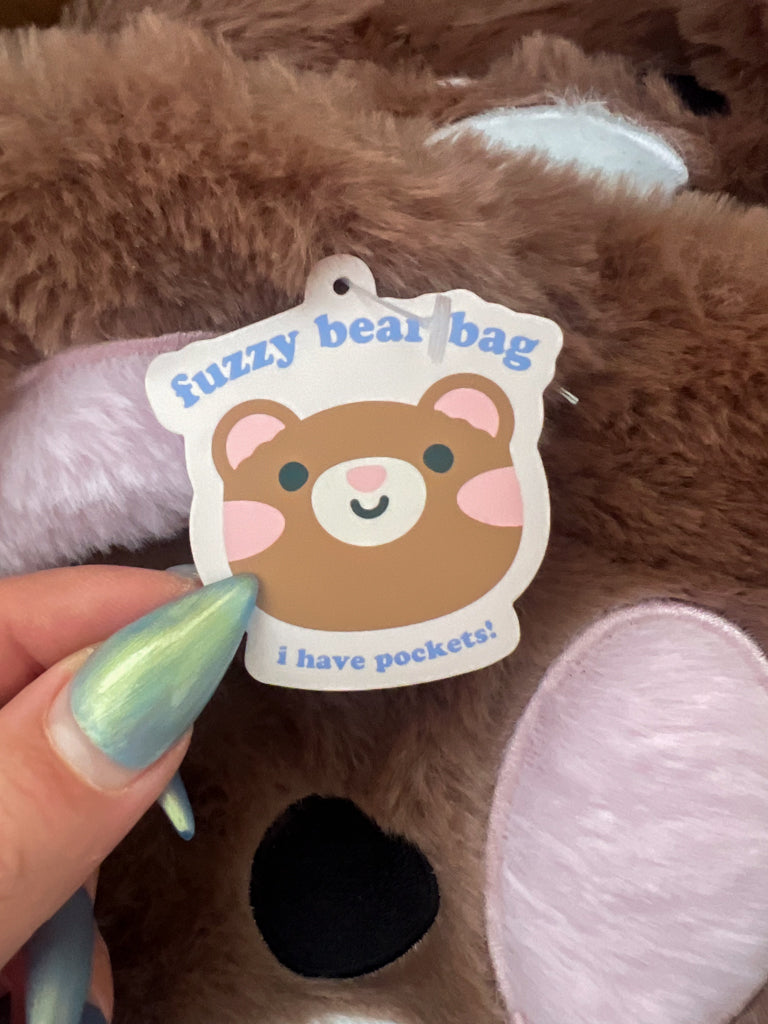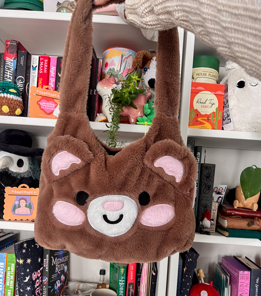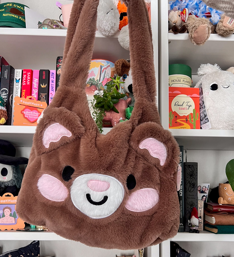 This tote is made of a fluffy brown fabric with a black lining inside.