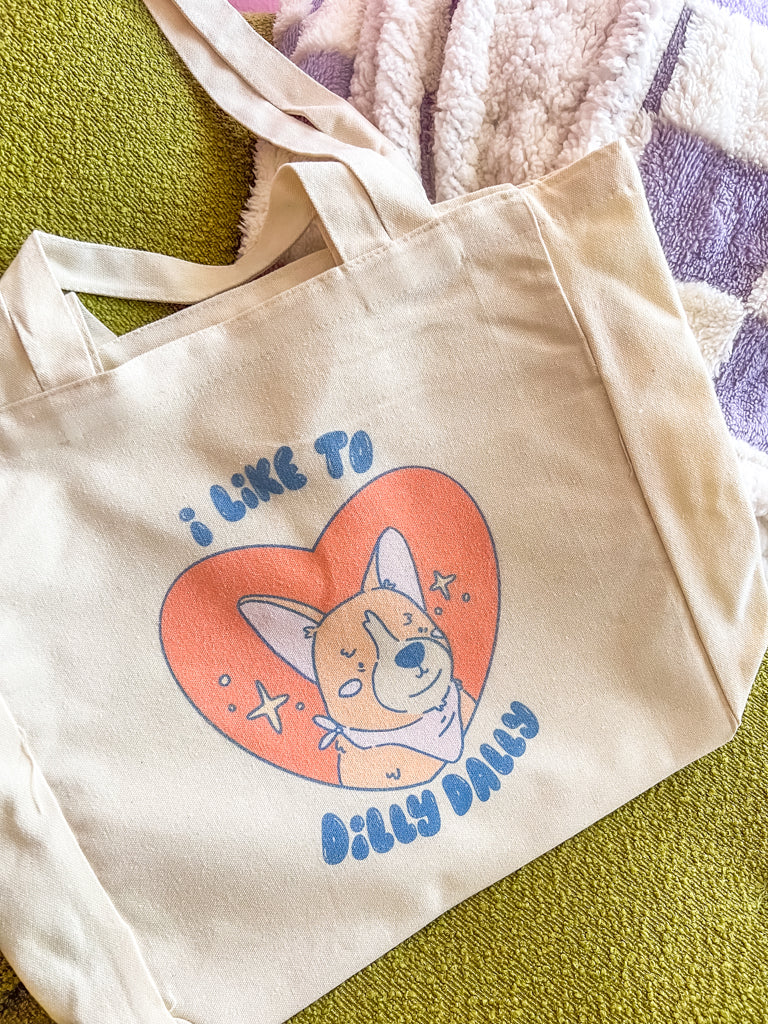 Printed in house on thick canvas tote bag that was custom made with a large inside pocket that can fit a 14inch laptop + a smaller pocket for keys or wallet!