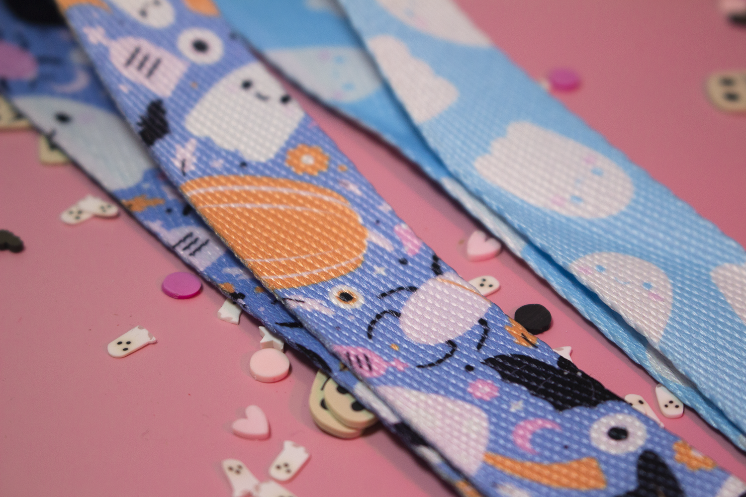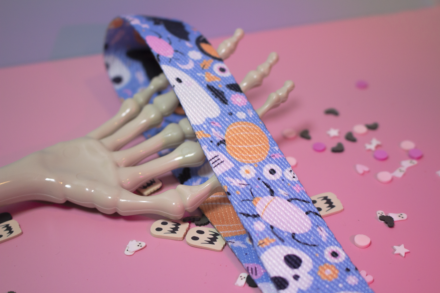 Halloween inspired wristlet lanyard with a bunch of little halloween illustrations on it.