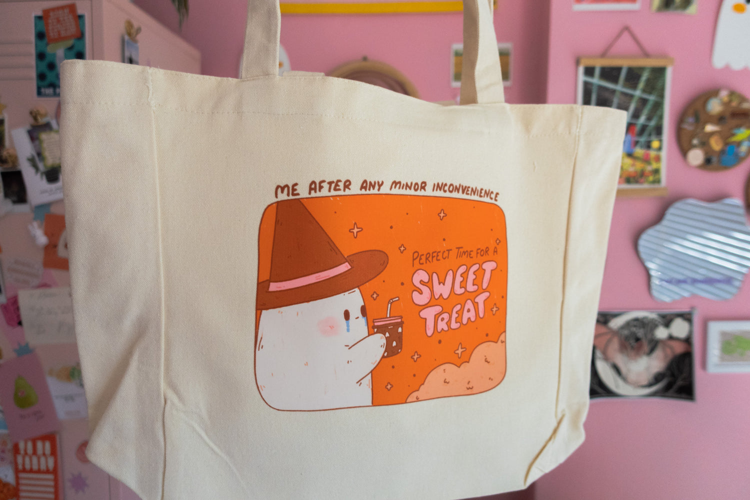 Printed in house on thick canvas tote bag that was custom made with a large inside pocket that can fit a 14inch laptop + a smaller pocket for keys or wallet!