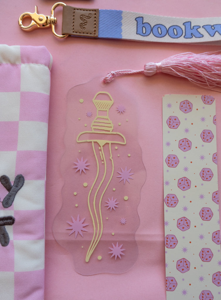Clear bookmark with a dagger and some stars.